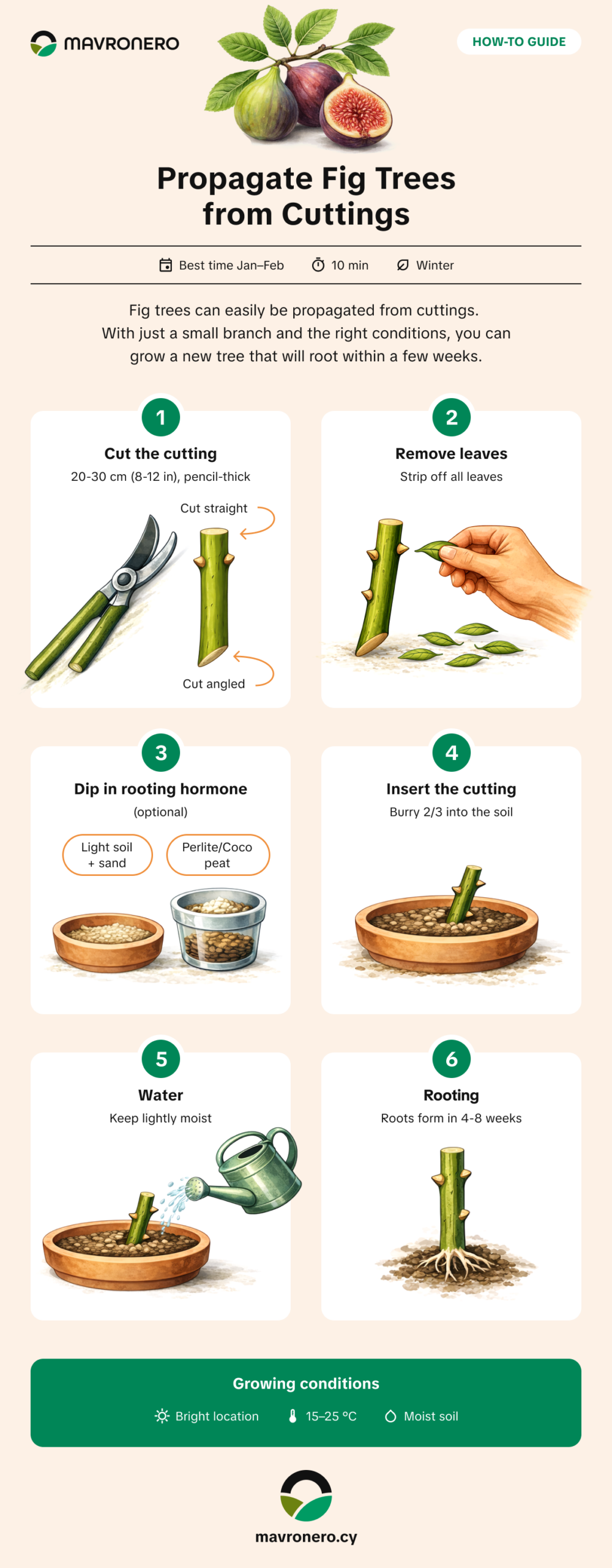 Fig cuttings root best in a bright location with temperatures between 15–25°C.