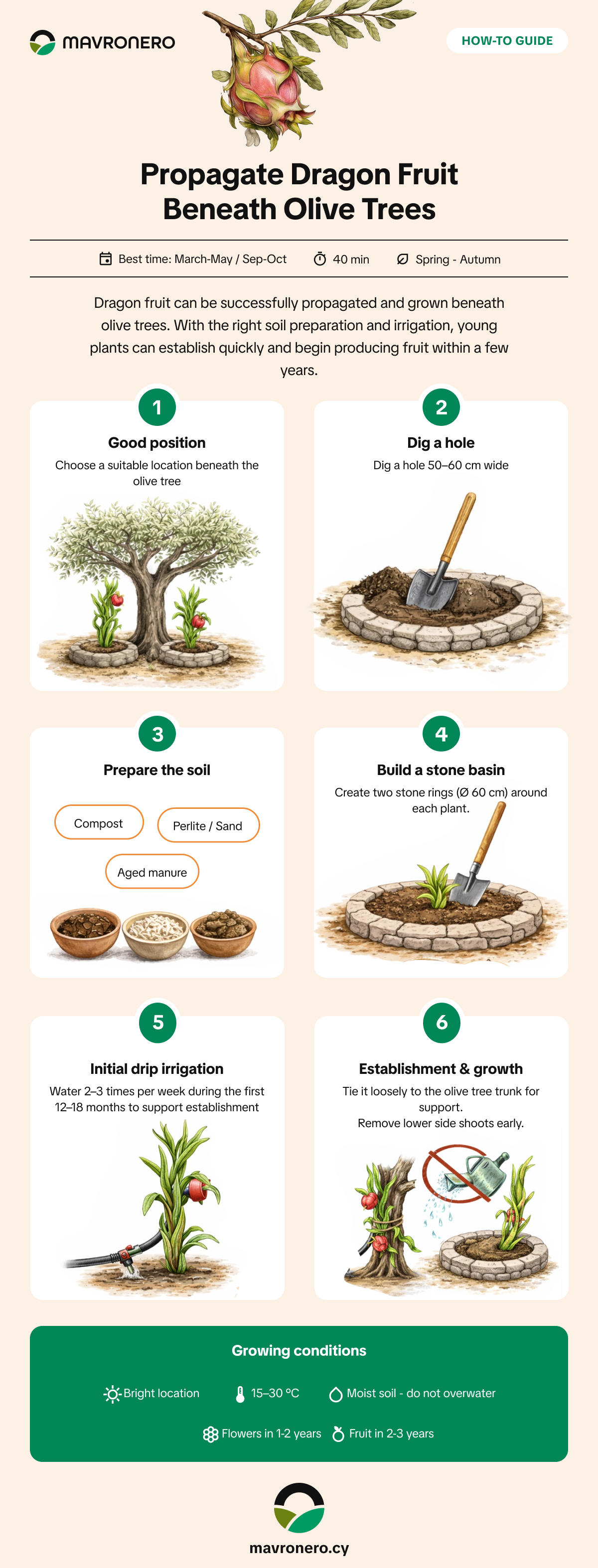 Dragon fruit (Hylocereus spp.) can be successfully cultivated beneath olive trees when the planting conditions are carefully prepared. The partial shade provided by mature olive trees creates a balanced microclimate that protects young plants from extreme heat while still allowing enough light for growth.