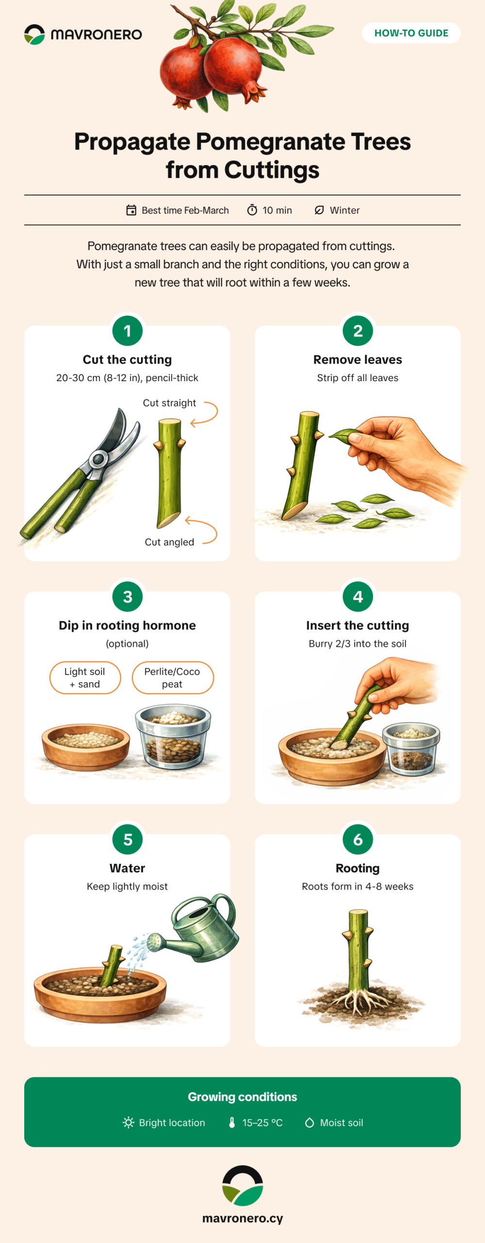 Pomegranate propagation from cuttings is a simple and reliable method for reproducing healthy trees while preserving well-adapted varieties.